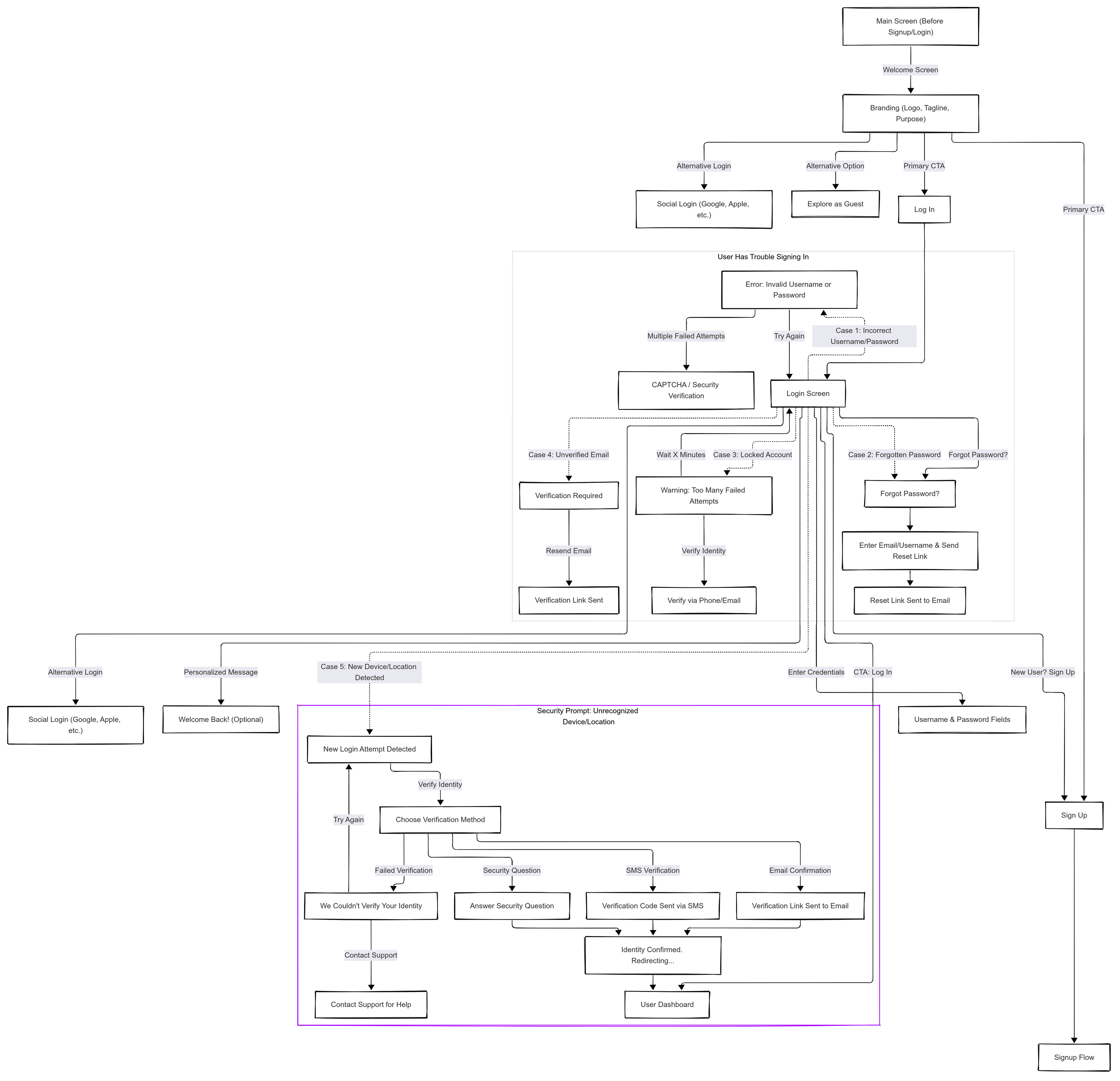 Created comprehensive user flows using Mermaid language for clear visualization, covering all authentication scenarios.
