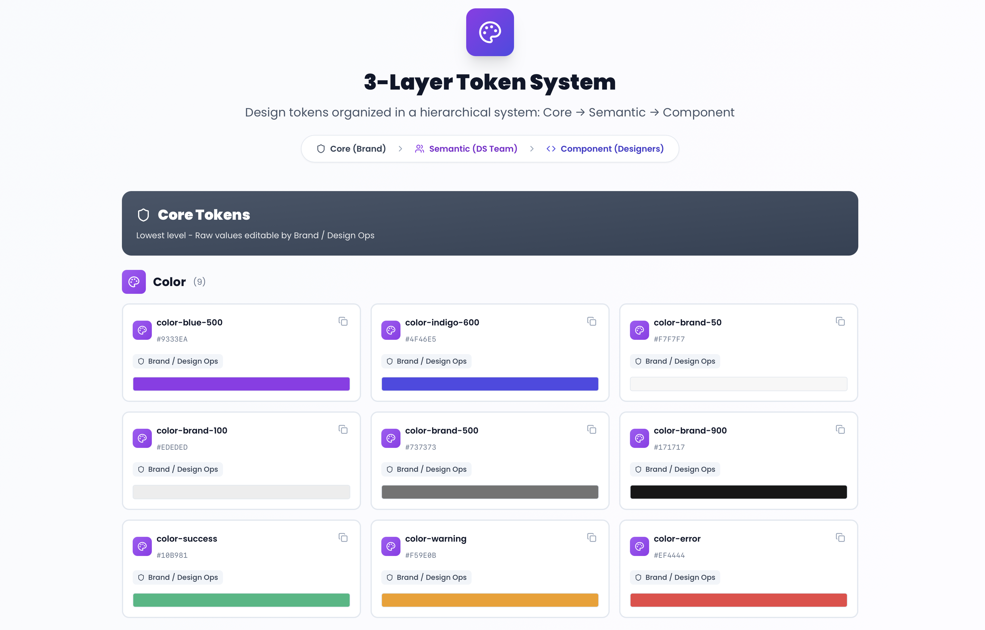 • Semantic Tokens: Context-aware tokens (primary, secondary, error, success) - managed by Design System Team