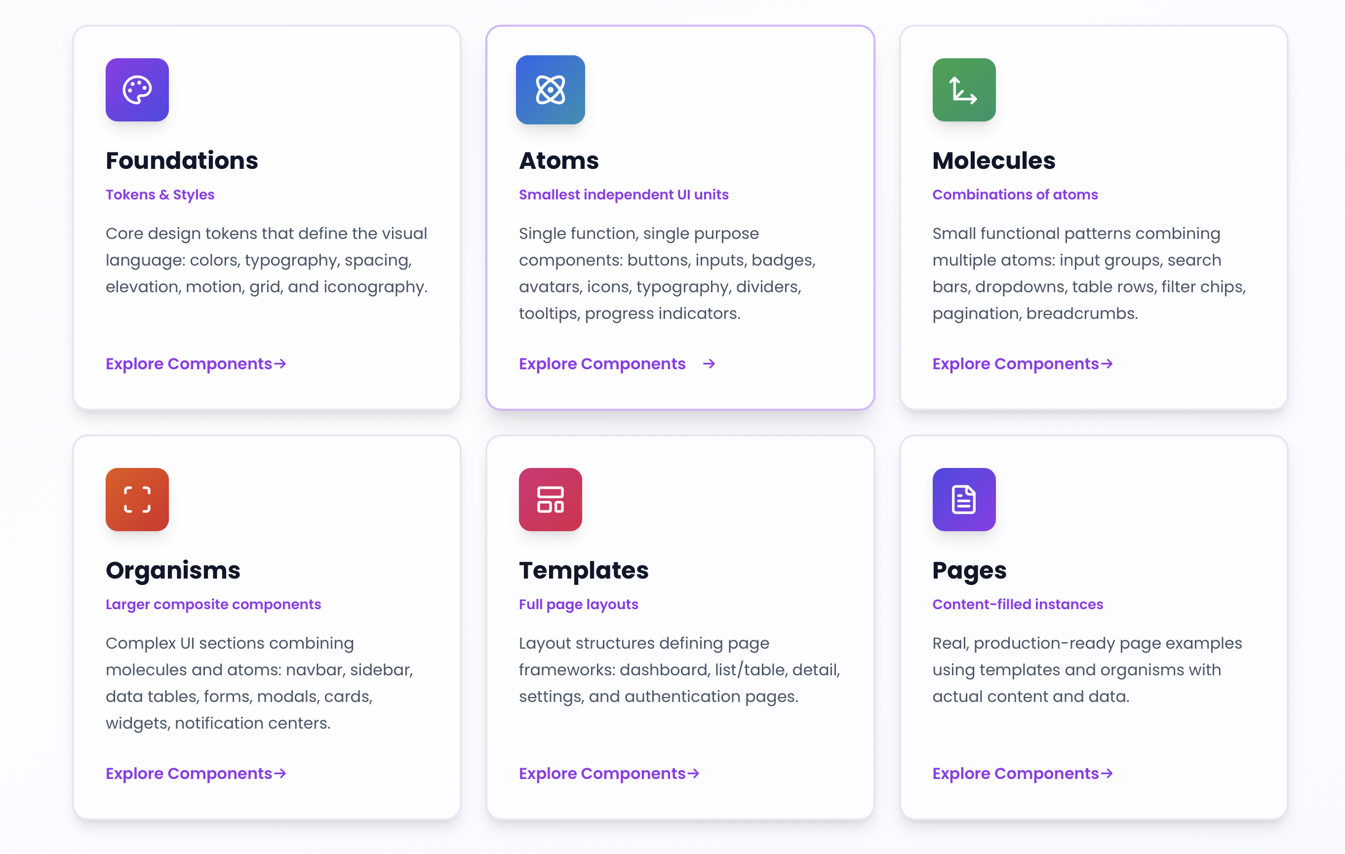 This design system was built to solve the challenge of maintaining consistency across modern web applications. Following atomic design principles, it organizes 70+ components into clear hierarchies from foundational tokens to complete page templates.